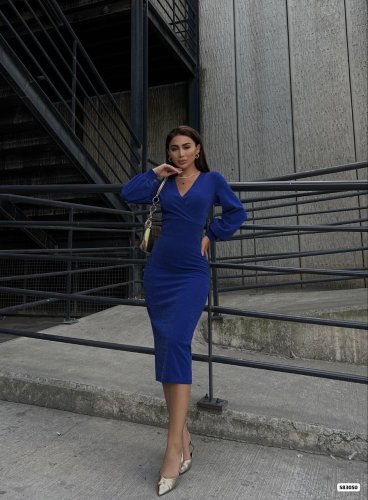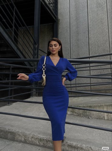 • Kadın kruvaze yaka balon kol simli krep kumaş midi boy elbise
