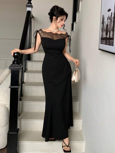 Kadın göğüs ve yakası dantel detaylı kayık yaka görünümlü uzun ithal krep elbise