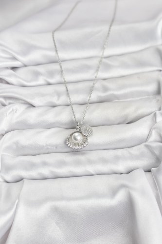 • 316L Çelik Zincir Gümüş Renk İncili Deniz Kabuğu Model Zirkon Taşlı Kadın Kolye